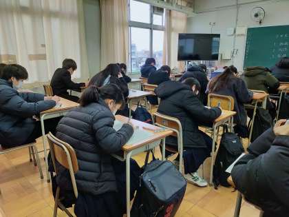 学年末テスト2日目です。1限目、社会のテストを集中して受けています。テスト前に仲間どうしで、問題を出し合って確認する姿や、黙々と書いて復習する姿が見受けられました。