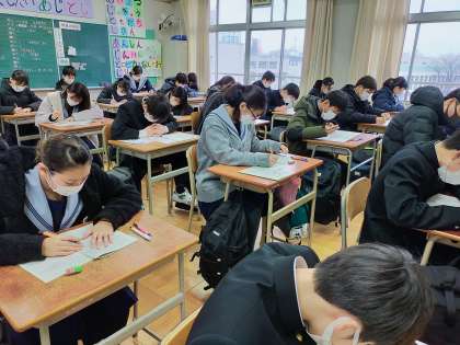 学年末テスト最終日です。1限目、英語のテストを受けています。今日で一年間のテストがすべて終わりました。明日から早速テストが返却されます。できなかったところの見直し、やり直しをきちんとして、自分の力を高めましょう。3学期が終わるまでの授業は、新しい学年への準備であるとともに、1学期のテスト範囲となります。授業を大切にしていきましょう!