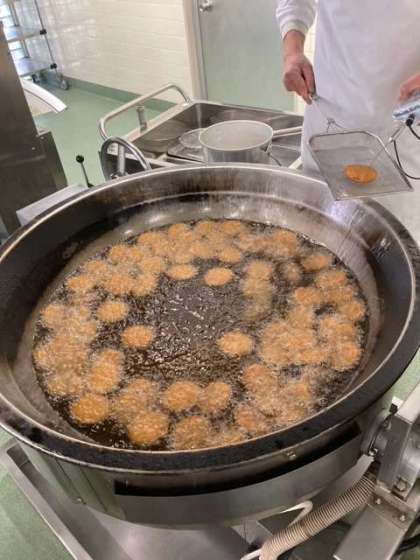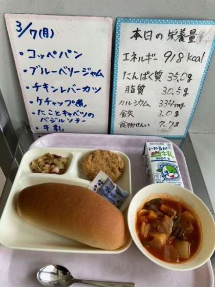 今日の献立は、コッペパン、ブルーベリージャム、牛乳、チキンレバーカツ、ケチャップ煮、たことキャベツのバジルソテーです。