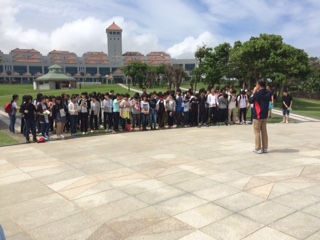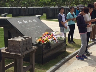 14:45 晴れ。沖縄県平和祈念資料館(平和の礎)で平和セレモニーを行ないました。また、みんなで「平和の鐘」を合唱しました。