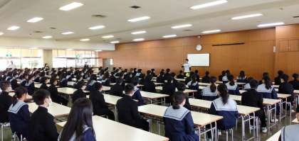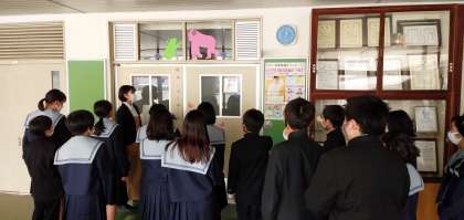 本日は、各学年で学校生活についてオリエンテーションや身体測定が行われました。写真は1年生の様子です。1年生では校舎内を見学したり、中学校のきまりの説明を受けました。