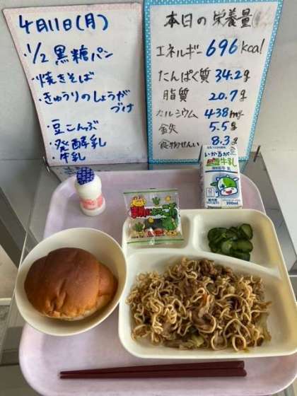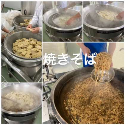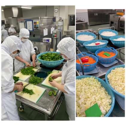 特に焼きそばは、大人気で残食も少なかったです。今日のキャベツ、ピーマンは包丁を使って切っていますが、玉ねぎと人参は機械を使って切っています。今年度は平野北中学校分は約460食の食事を安全に作っていきます。