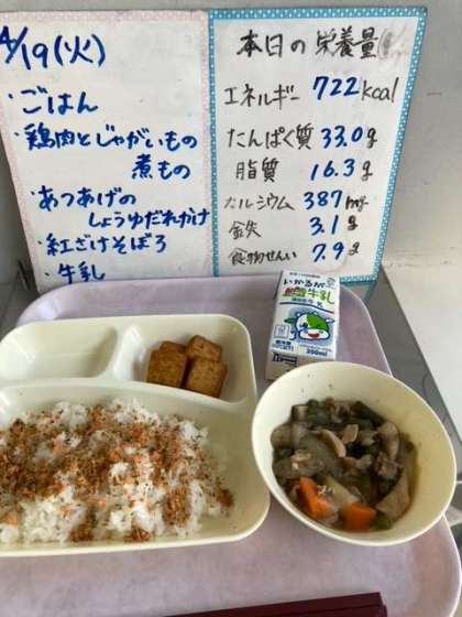 今日の献立は、ご飯、牛乳、鶏肉とじゃがいもの煮物、厚揚げのしょうゆだれかけ、紅鮭そぼろです。
