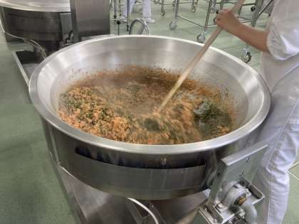 給食の紅鮭そぼろは、紅鮭といりごま、青のりを言って作ります。素材の味と彩りを良くするため、料理酒、みりん、薄口醤油のみで味付けをしています。