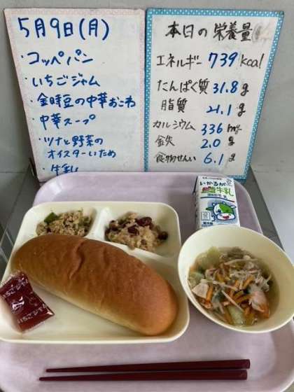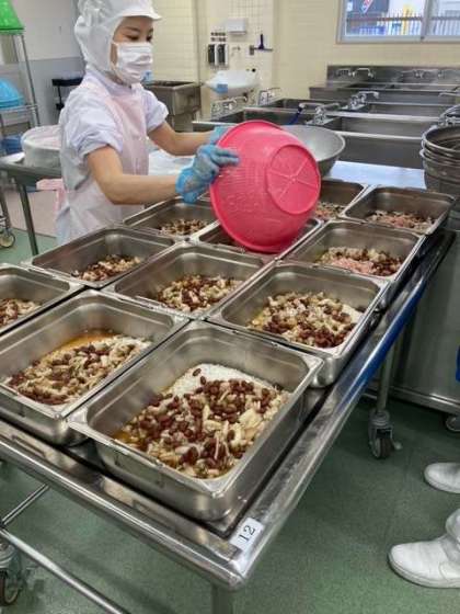 今日は、鶏肉、金時豆、しめじの入った「金時豆の中華おこわ」です。おこわには、独特のモチモチとしたと食感と甘みがあります。また、給食では、もち米をぬるま湯に60分間浸してから蒸し上げます。