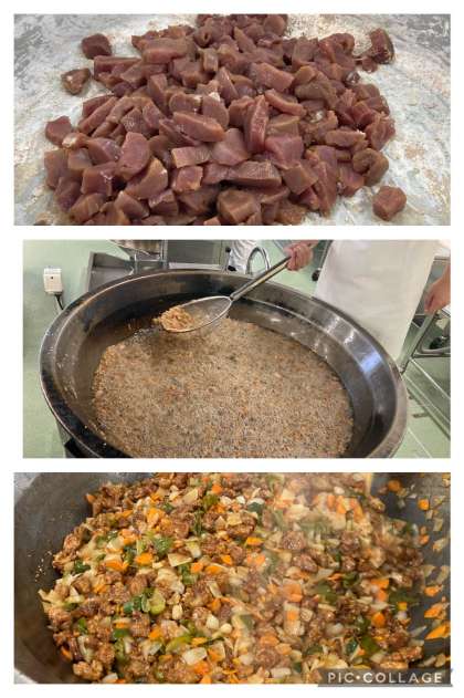 2、野菜をいため、砂糖、塩、米酢、こいくちしょうゆ、ケチャップで味付けをする