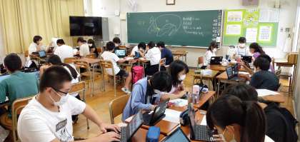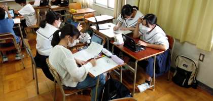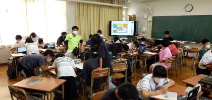 1年生は今、平和学習に取り組んでいます。今日はロシアとウクライナについてタブレットを使って調べました。文化祭で平和への願いをこめた作品を展示する予定です。