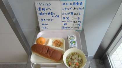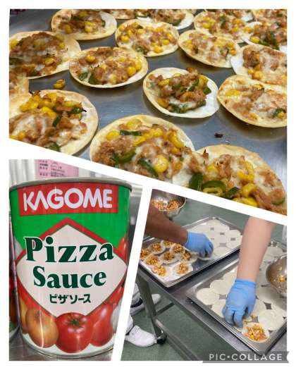 給食の変わりピザは、餃子の皮に、ツナ、コーン、ピーマン、ピザソース、チーズを混ぜ合わせた具材をのせ、焼き物機で焼いています。