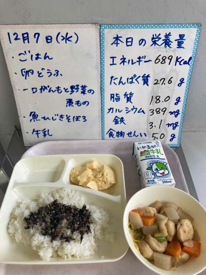 給食の一口がんもは、とうふやにんじん、でんぷんなどから作られた1個約5gの小さいものを使っています。