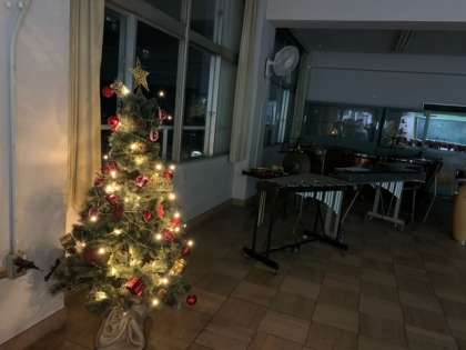 明日は吹奏楽部のクリスマスコンサートです。合奏練習の後、全部員が協力して会場設営をしました。大きなクリスマスツリーがキラキラしています。明日は北館3階歴史室で2時半から開演します。