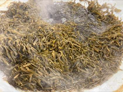 くきわかめは、わかめの葉の太くかたい芯の部分で、こりこりした歯ごたえが特徴です。骨や歯を強くするカルシウム、ナトリウム、カリウムなどが多く含まれています。