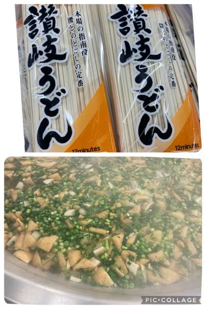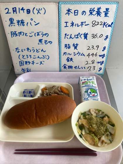 なにわうどんはきつねうどんをイメージしています。三角形に切って甘辛く煮たうすあげ、かまぼこ、青ネギが入ったうどんにとろろこんぶをいれて食べます。