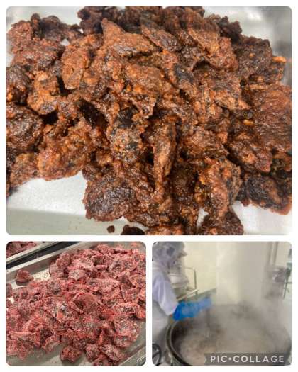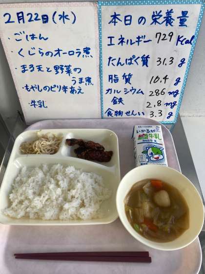 今日のくじらのオーロラ煮は、下味をつけて油で揚げたくじらに、ケチャップや赤みそなどで作ったたれを絡ませています。