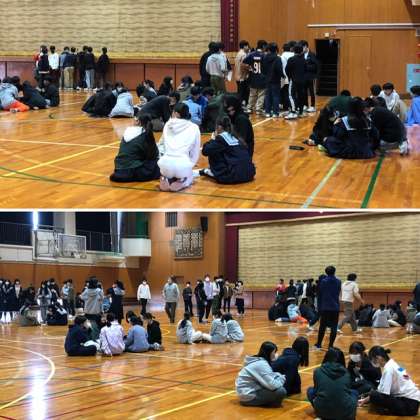 3年生は1限目に体育館で修学旅行の取り組みを行いました。