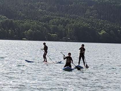 8m下の湖底まで見える水のきれいな青木湖でSUP体験をしました。最初は怖がってた人も、最後には立てるまでになりました。