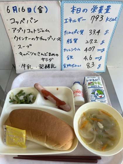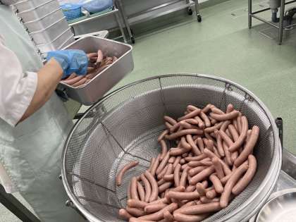 ウインナーソーセージは、オーストラリアのウィーンで作り始められたといわれています。給食では、豚肉、塩、香辛料などを混ぜ合わせたものを使っています。ケチャップソースをかけて食べました。