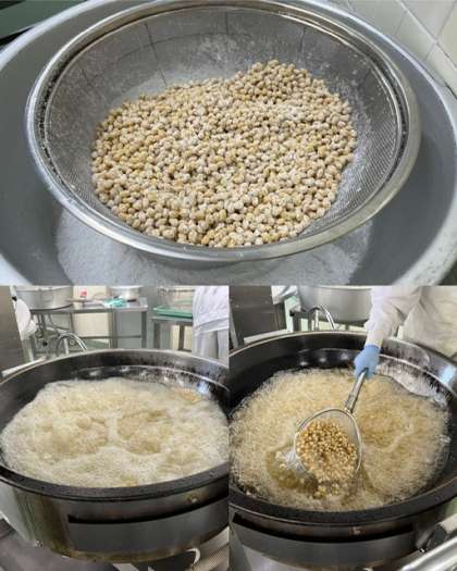 ひじき豆は、片栗粉をまぶした大豆を油で揚げ、水で戻したひじきと砂糖としょうゆを煮詰め、揚げた大豆と絡ませて作っています。