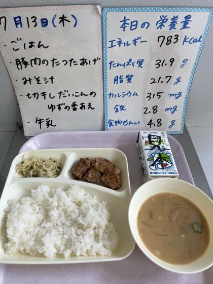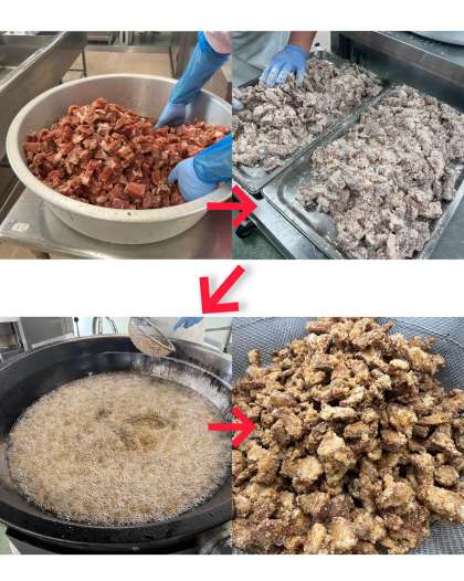 豚肉のたつたあげは、しょうが汁、料理酒、こいくちしょうゆで豚肉に下味をつけ、片栗粉をまぶして、なたね油で揚げています。人気メニューの一つです。