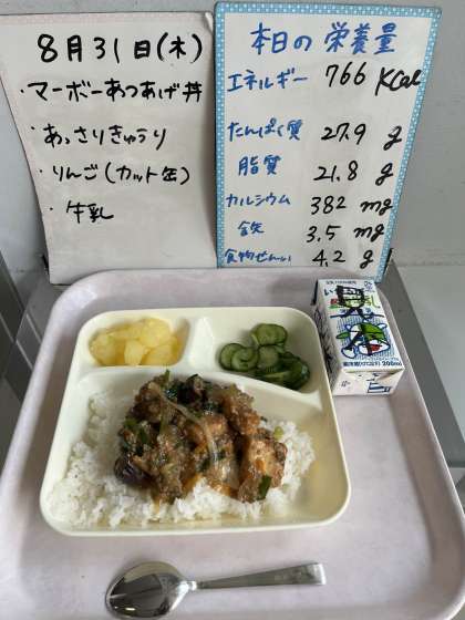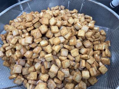 あつあげは、大豆が原料の加工食品で、「なまあげ」ともいいます。厚めに切った豆腐の水分をきり、高温の油で揚げます。今日のマーボーあつあげ丼に使用しました。
