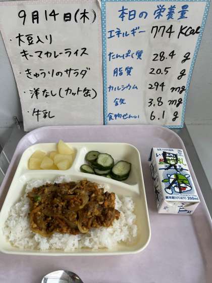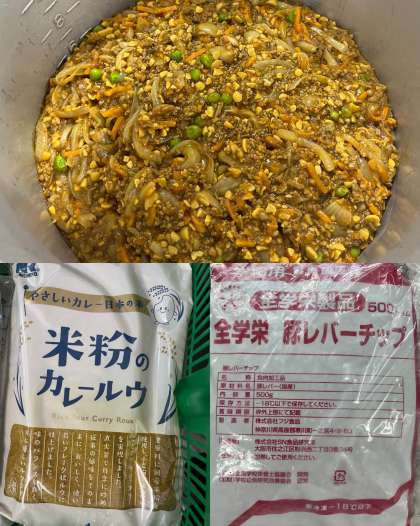 今日の大豆入りキーマカレーライスには、新食品の「豚レバー」を使っています。レバーは少しくせのある食品ですが、細かく切った豚レバーをひき肉と一緒に使うことで、食べやすくなるように工夫しています。