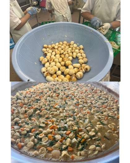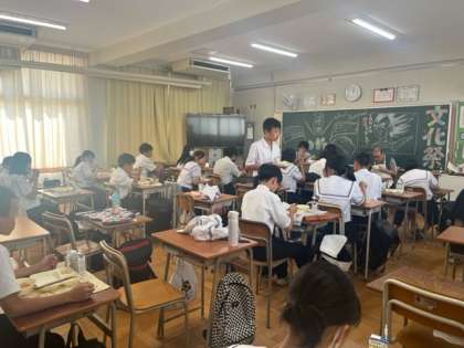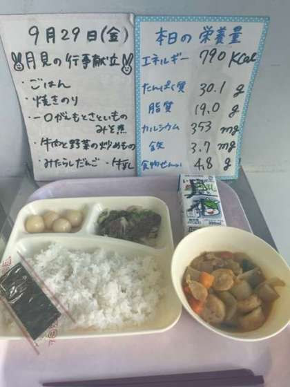 月見の行事献立でした。さといもは、調理員さんが一つ一つ皮をむき、手切りし、みそ煮に使用しています。