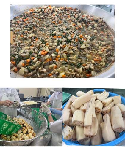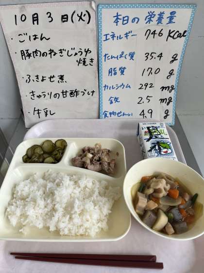 今日の給食は、さといも、れんこん、しめじなどを使ったふきよせ煮でした。