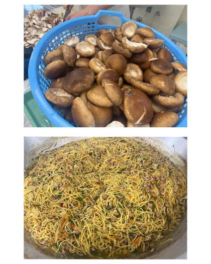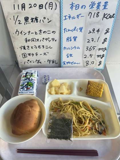 日本には、食用になるきのこが約100種類あります。きのこには、それぞれの独特の香りや味、歯ごたえ、舌触りなど食感のちがいがあります。給食には、7種類のきのこが登場します。今日のスパゲッティには、しいたけとしめじが使われています。