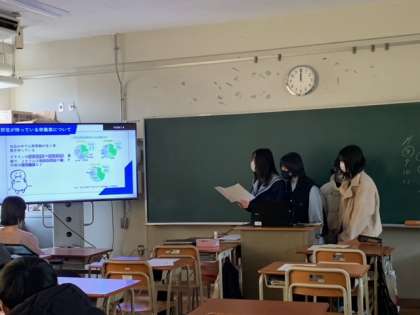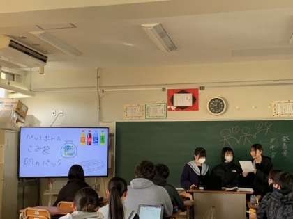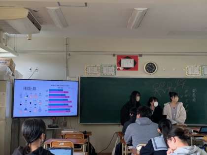 中学校国語の集大成として、プレゼンテーションを実施しました。グループごとにテーマを決め、それを探求します。探求内容をパワーポイントにまとめ、それを使ってプレゼンテーションを行いました。グラフを添付して、わかりやすい説明を心がけました。