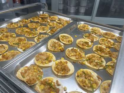 給食の変わりピザは、ぎょうざの皮に、ツナ、コーン、ピーマン、ピザソース、チーズを混ぜ合わせた具をのせ、焼き物機で焼いています。生徒に大人気の献立です。