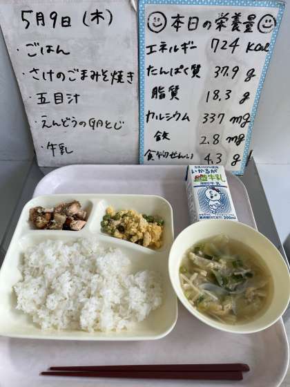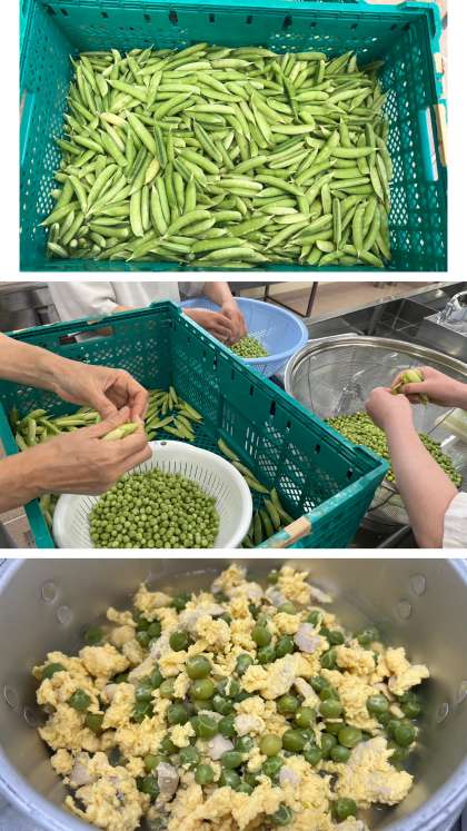 今日は、給食室で一つ一つさやから取り出したえんどうを使って、えんどうの卵とじを作りました。