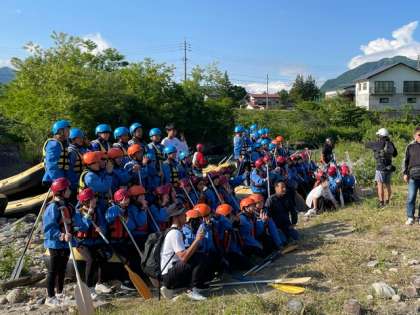 渋滞のため定刻から1時間遅れとなりましたが、今からラフティングです。写真は出発前のクラス写真撮影です。
