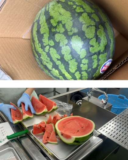 給食室では、大きなすいかを1人の給食調理員さんが次々に切り、バットに並べます。