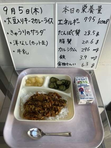 今日の大豆入りキーマカレーライスには、豚レバーチップを使っています。レバーは、少し癖のある食品ですが、細かくカットした豚レバーを、ひき肉と一緒に使うことで、食べやすくなるよう工夫されています。