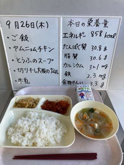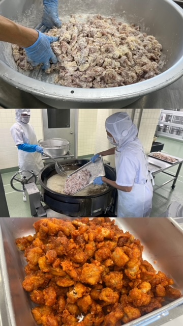 まだまだ暑い給食室ですが、高温の油で、鶏肉を揚げて、ヤンニョムチキンは作られています。大変な環境で、調理してくださる給食調理員さんに感謝して、残さず食べましょう。