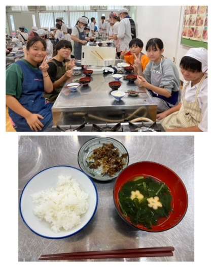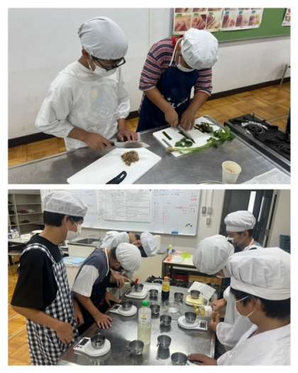 1年2組と1年4組が家庭科の時間に、調理実習を行いました。だしを活用して、すまし汁と手作りふりかけを作りました。