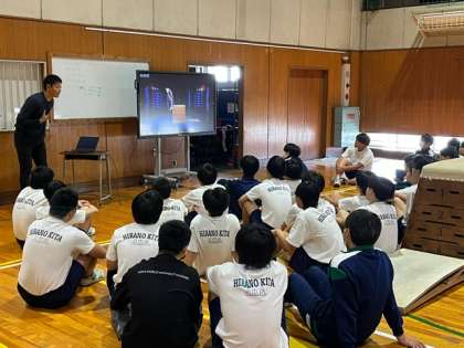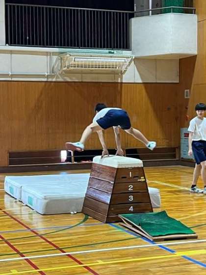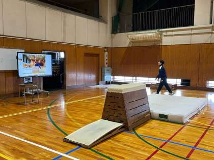 跳び箱運動の授業です。きれいに跳ぶことを意識して練習しています。成功例の映像を見たあと、自分の跳ぶ映像も確認し、技能の向上に繋げています。