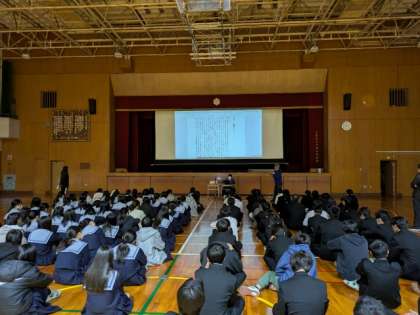 本日3年生は1限に道徳の授業を体育館で行いました。テーマは国際貢献。教材は日本とトルコの関係が深まったエルトゥールル号事件です。