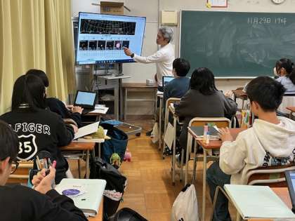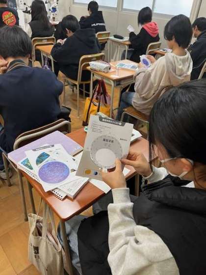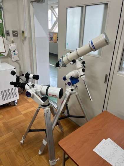天体観測の方法について学習しています。教科書の付録を組み立てて星座早見盤の使い方を確認した後、端末で国立天文台のHPから今日の星空を見てみました。今週末に開催される天体観測会に向けて、天体望遠鏡の使い方の説明を受けました。この天体望遠鏡は先生の私物だそうです。素晴らしい趣味を持っておられますね。