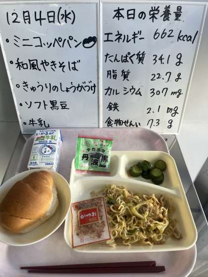 和風焼きそばは、塩、こしょう、しょうゆで味を付けた、しょうゆ風味の焼きそばです。生徒に大人気で、すべてのクラスが完食していました。