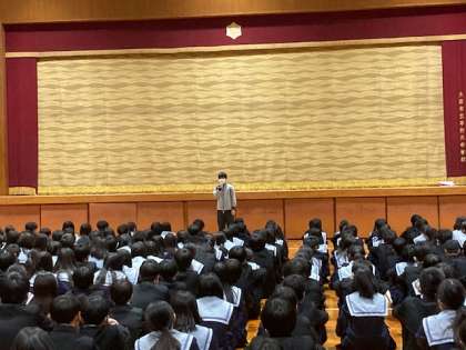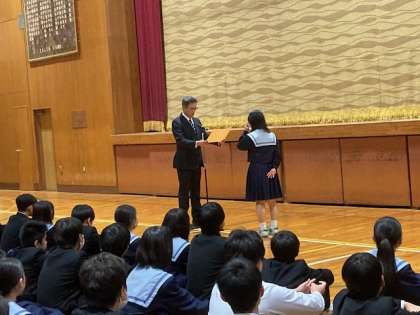 3年生の人が「税に関する作文」で表彰があり、その後、校長先生のお話→生活指導の先生からのお話があり、終業式を無事に終えました。
