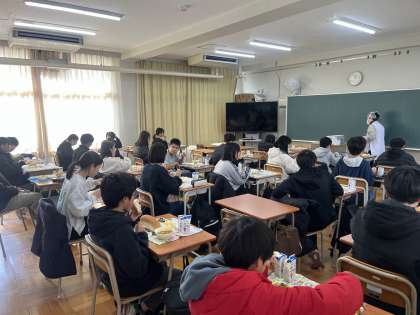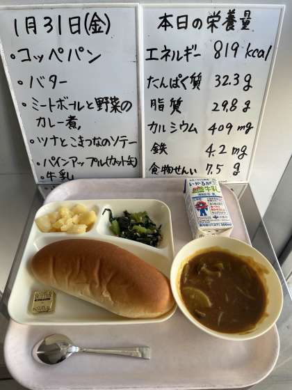 給食の肉だんごは、牛肉、豚肉、鶏肉、たまねぎ、でんぷん、塩、砂糖、こしょう、香辛料などを混ぜ合わせて作っています。今日の「ミートボールと野菜のカレー煮」に使用されました。