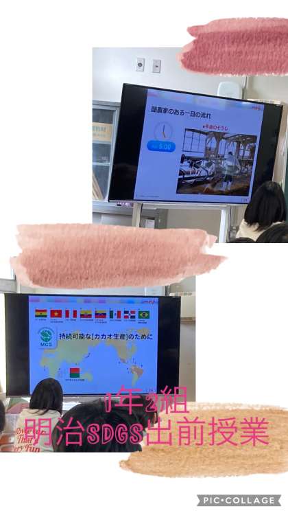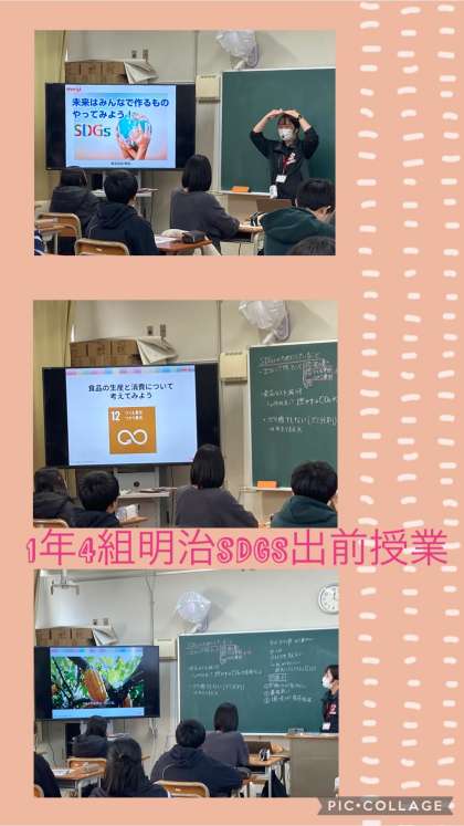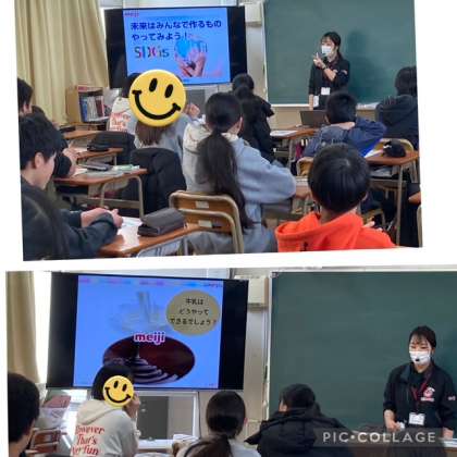 社会科の時間で3限目:1年2組、4限目:1年4組に明治乳業の方をお招きし、SDGs出前授業をしました。SDGsとは何かを学んだ後、普段自分がSDGsのためにしていることを意見交流し、発表しました。その後、酪農家さんが抱える問題を考え、チョコレートについて学習しました。最後に、自分がSDGsについて継続してできることをワークシートに記入し、発表しました。生徒の意見は、ゴミの分別をする、残さず食べる、食品ロスをしないようにするなどでした。