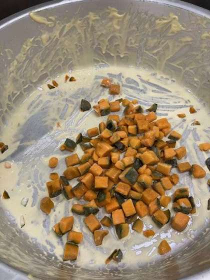 かぼちゃに野菜ブイヨン、ノンエッグドレッシングを合わせて下味をつけ、焼き物機で焼きます。