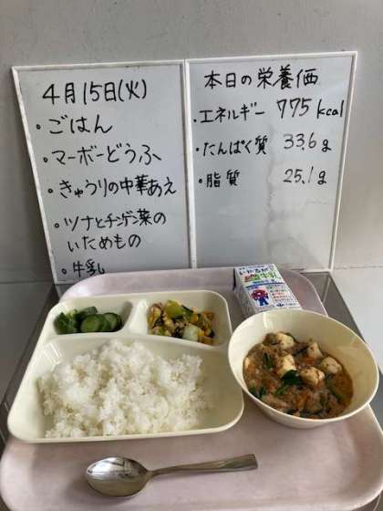マーボーどうふは、中国の四川(しせん)料理です。山椒のしびれる辛さを表す「麻(マー)」と唐辛子の辛さを表す「辣(ラー)」を用いて「麻辣(マーラー)豆腐」と呼ばれることもあります。今日の給食ではトウバンジャンを使って辛みを付けています。