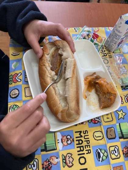 今日の給食のパンにチーズとハンバーグを
