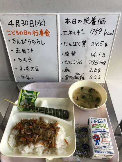 今日はこどもの日の行事食事献立で「ちまき」が登場しました。関東では柏餅が食べられることが多いです。