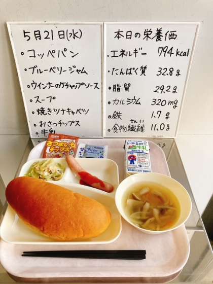 今日の給食では、豚肉、塩、香辛料などを混ぜ合わせて作られたウィンナーソーセージに手作りのケチャップソースをかけています。