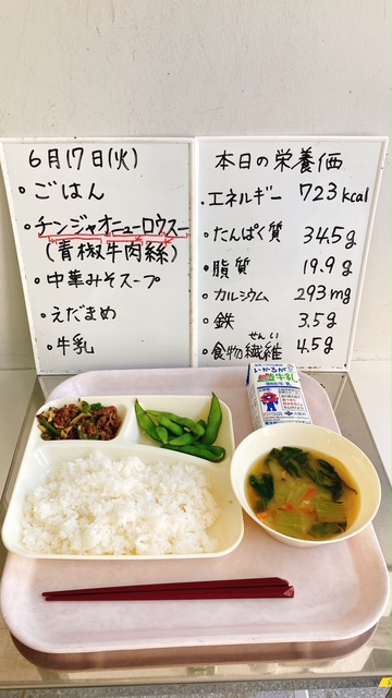 給食では、牛肉と細切りにしたピーマンやたけのこなどを炒め、砂糖やしょうゆ、オイスターソースなどで味付けしています。
