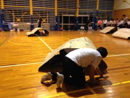 > 人間がキャタピラになってのクラス対抗リレーです。右へ左へと、担任の先生の指示も重要です。