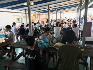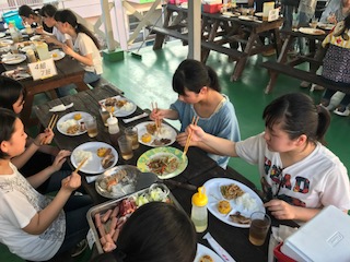 夕食のバーベキューです。うまく焼けた班、こげた班といろいろですが、たのしくいただきました!